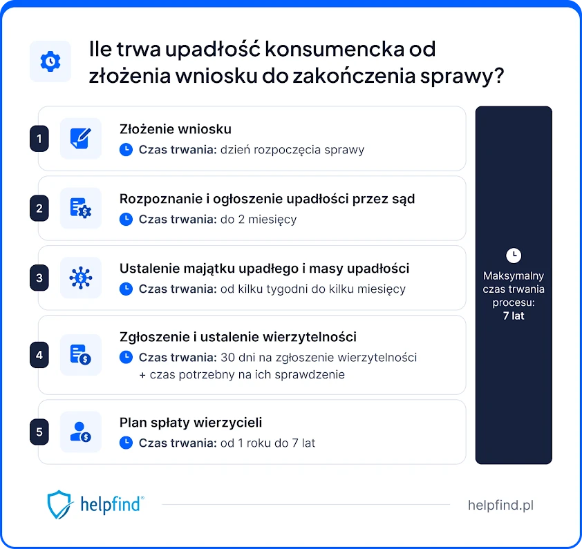 Najwięcej czasu zajmuje zwykle plan spłaty wierzycieli, który może trwać od roku do 7 lat, choć w prostszych sprawach bez majątku cała procedura może zakończyć się szybciej.